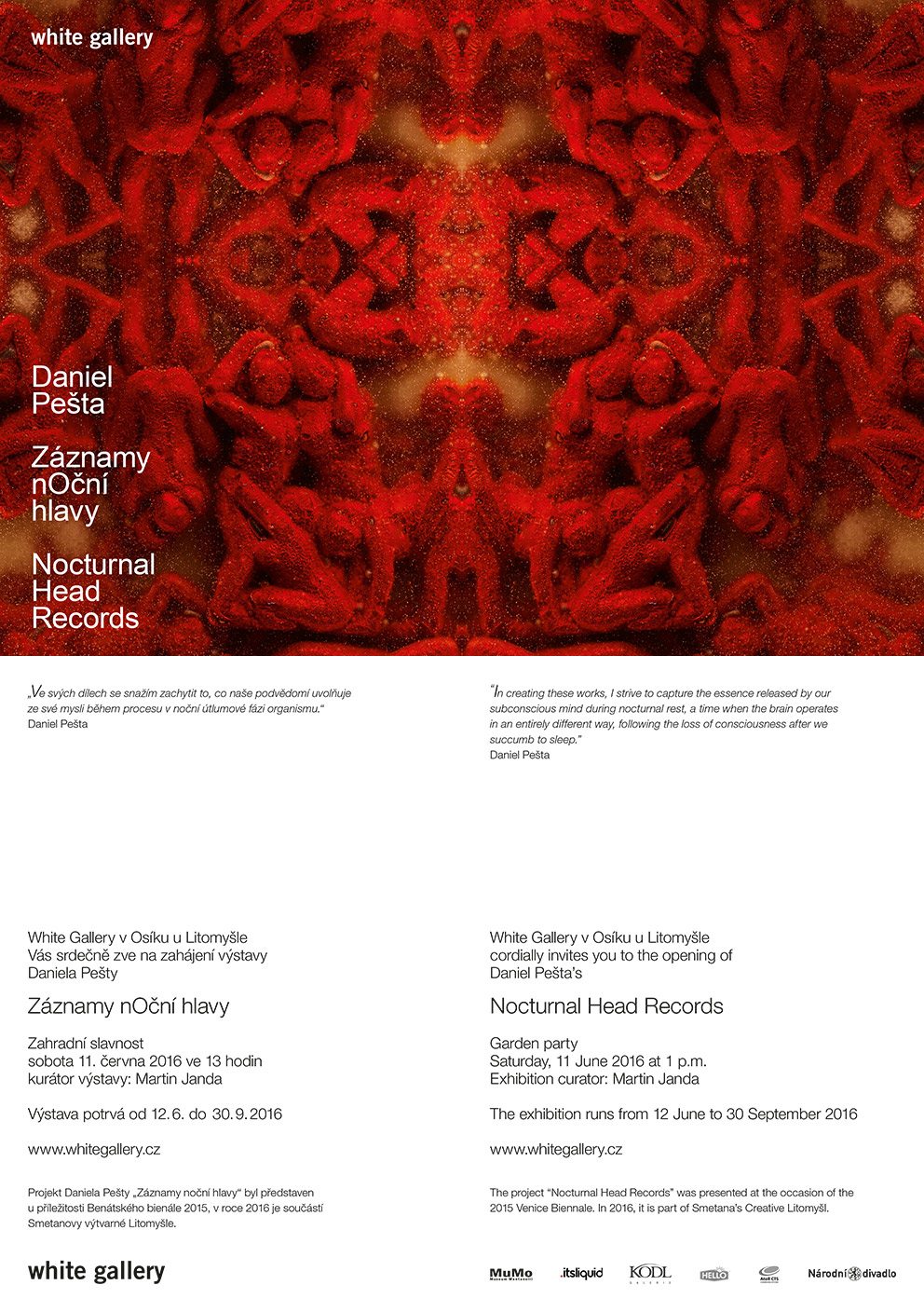 Výstavou Daniela Pešty White Gallery reaguje na největší přehlídku umění – Bienále v italských Benátkách 2015 –, odkud přebírá jeho okouzlující a zároveň děsivé objekty v projektu nazvaném Záznamy noční hlavy. Přenesení výstavy z Palazzo Bembo v centru Benátek do Osíka je doplněno řadou dalších děl, z nichž některá vznikají přímo pro výstavu ve White Gallery.