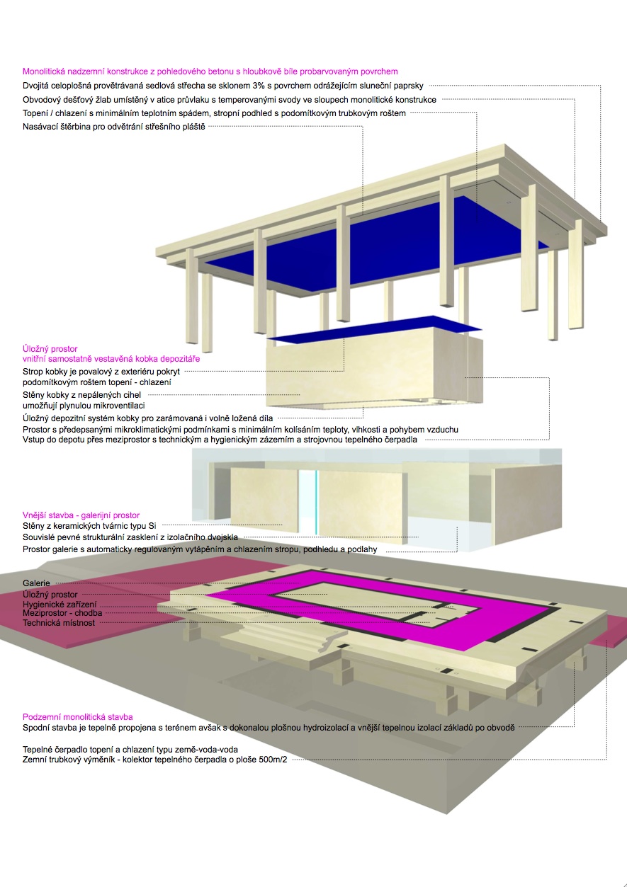 Projekt White Gallery byl již ve fázi návrhů zcela unikátním případem z hlediska koncepce klimatologie budovy určené k uchovávání cenností na papírovém podkladě. Způsob, kterým se budovu podařilo navrhnout je v celoevropském měřítku existujících depozitářů jedinečný a předurčuje ideální řešení pro další projekty kladoucí maximální důraz na kvalitu vnitřního klimatu. Důsledným dodržením všech obecně formulovaných kritérií a projektem zpřesněných řešení se podařilo vytvořit budovu, která je klimatologicky stabilní ve všech měřených parametrech bez použití chladicích rozvodů vzduchotechniky. Tato skutečnost se ukazuje jako zcela zásadní přínos pro obecná pravidla při stavbě nových depozitářů. Doposud realizované budovy, které jsou klimatizovány pomocí trubních systémů vzduchotechnikou se projevily jako zcela nevhodné a nebezpečné pro uchování cenností na papírovém podkladě. Naše koncepce vychází z řešení „domu v domě“, přičemž hmota vnější stavby je temperována, chlazena nebo vytápěna pomocí uzavřených rozvodů kapalného media v tenkostěnných trubičkách osazených přímo do konstrukce stavby. Rozvodům dodává příslušnou teplotu tepelné čerpadlo třetí generace využívající plošný kolektor pod úrovní terénu v okolí budovy. Vnitřní stavba depozitární kobky z nepálených cihel je bez tepelné korekce, využívá pomalý tepelný spád a mikroventilaci k odbourání teplotních a vlhkostních výkyvů meziprostoru, který slouží jako galerijní prostor.