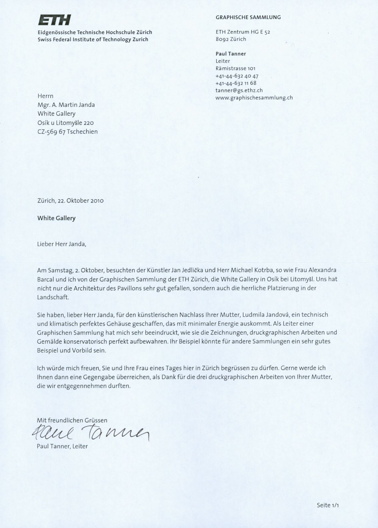 Dopis od Paula Tannera, Swiss Federal Institute of Technology Zurich